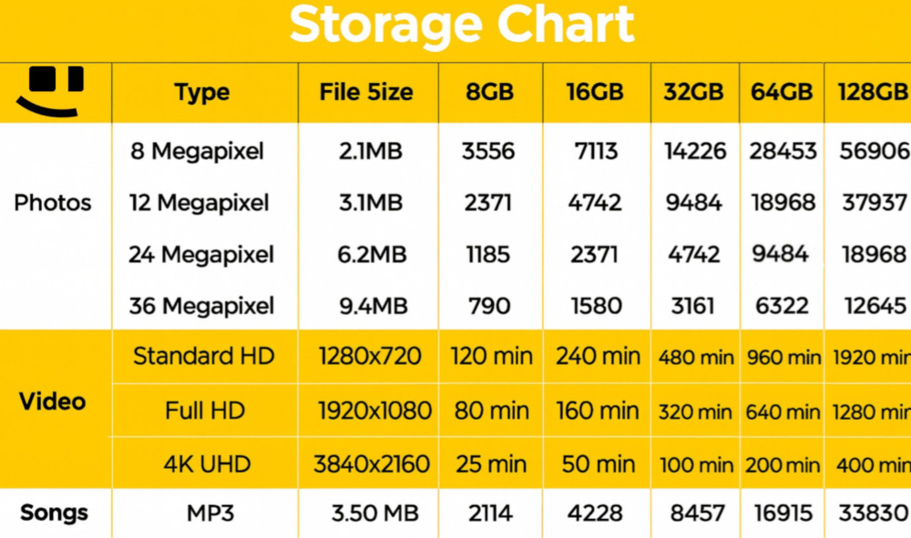 در جدول زیر میبینید که با هر ظرفیت فلش مموری، تقریباً چه تعداد عکس، آهنگ یا ویدیو (در کیفیتهای مختلف) میتوانید ذخیره کنید.