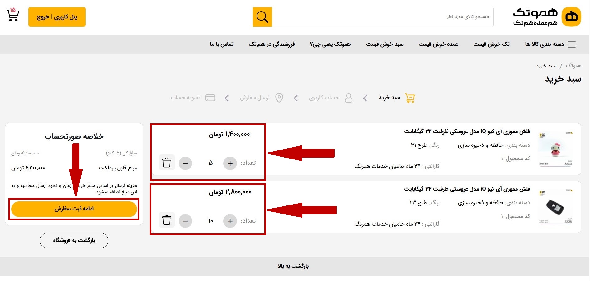 4 پس از ورود می توانید در سایت جستجو کنید و محصولات را با هر تنوع و تعدادی به سبد خرید خود اضافه کنید.