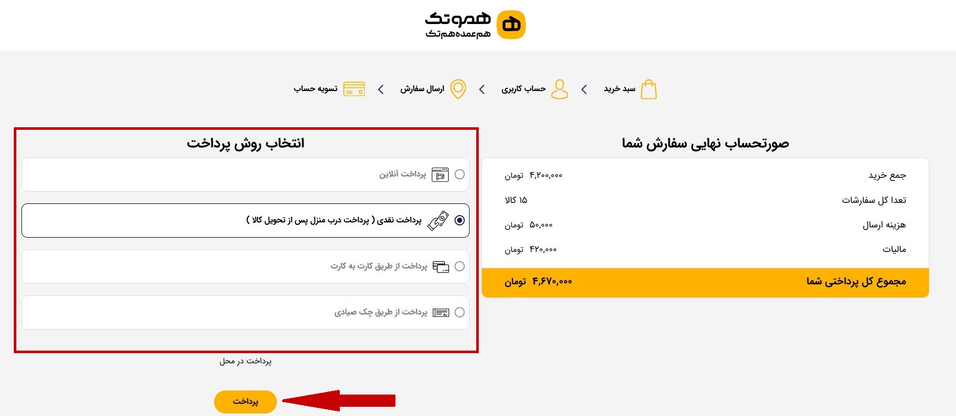10. شیوه پرداخت خود را انتخاب کرده و روی گزینه پرداخت کلیک کنید.