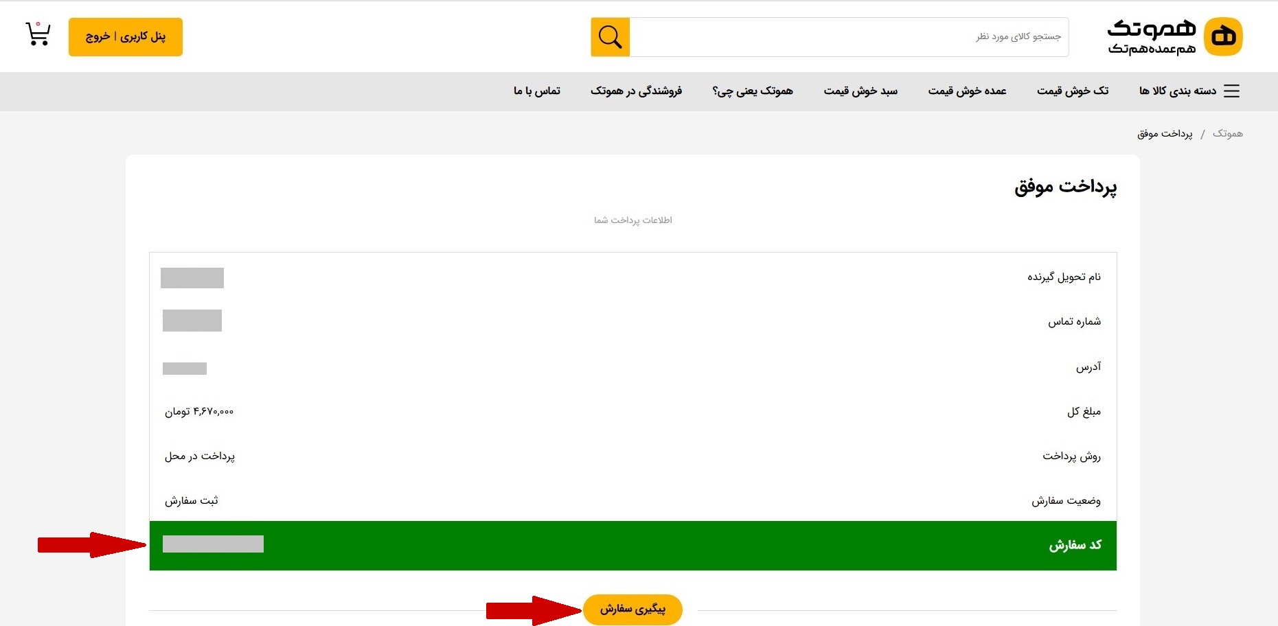 11. پس از پرداخت موفق وارد این صفحه خواهید شد و میتوانید با کلیک روی پیگیری سفارش از جزییات سفارش خود مطلع شوید.