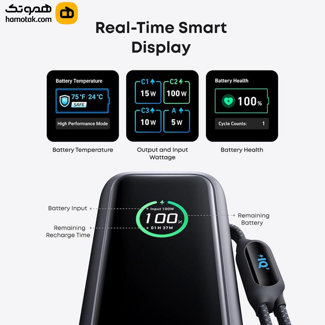 وجود نمایشگر دیجیتال هوشمند روی بدنه باعث میشود اطلاعات مانند درصد باتری باقیمانده، توان خروجی و ورودی و وضعیت شارژ بهصورت دقیق قابل مشاهده باشد، که برای مدیریت بهتر شارژ بسیار کاربردی است. این پاوربانک همچنین از استانداردهای ایمنی مانند MultiProtect بهره میبرد تا در برابر افزایش دما، نوسانات ولتاژ و اتصال کوتاه محافظت لازم را فراهم کند.