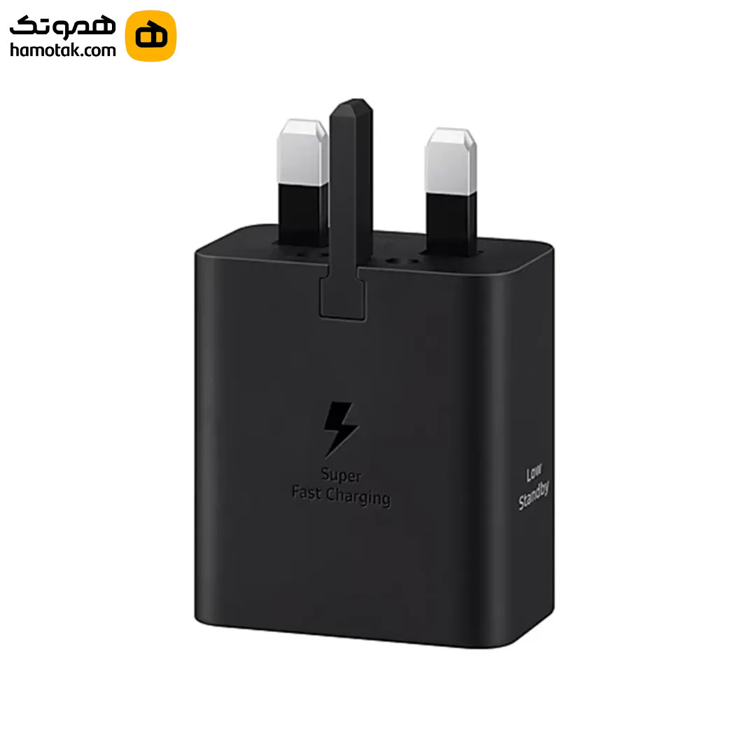 آداپتور شارژ 45 وات سامسونگ با بدنهای جمعوجور، مقاوم و طراحی مینیمال عرضه میشود. جنس بدنه آن از پلاستیک فشرده مقاوم در برابر حرارت ساخته شده و دوام بالایی در استفاده طولانیمدت دارد. طراحی سهپین و درگاه USB Type-C در بخش خروجی، باعث میشود اتصال کابلها کاملاً پایدار و بدون قطع و وصلی انجام شود.